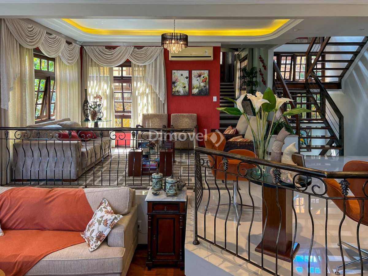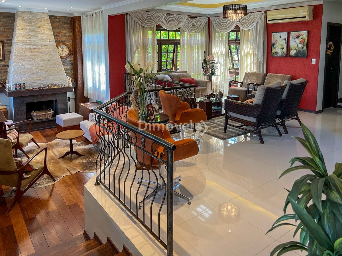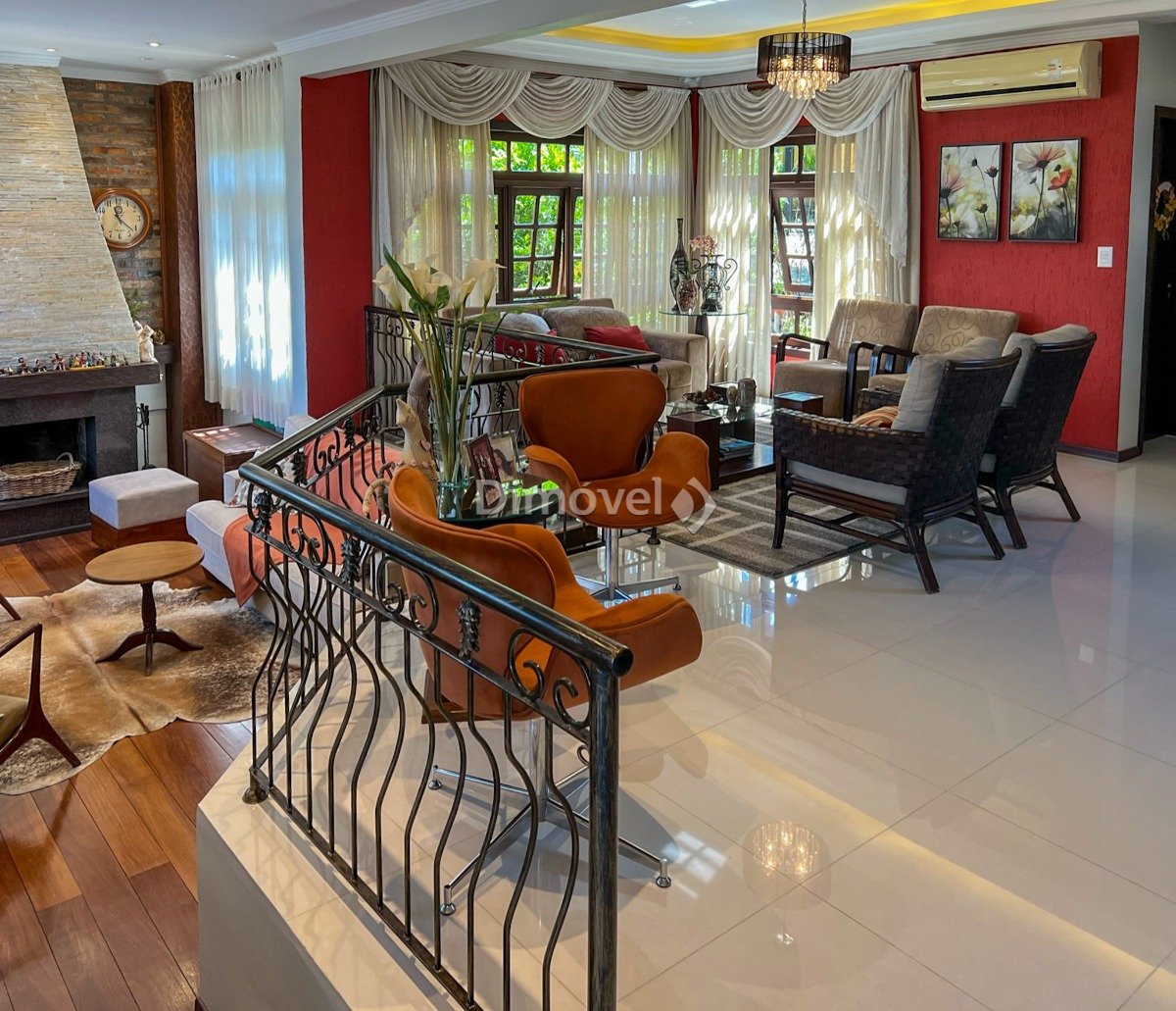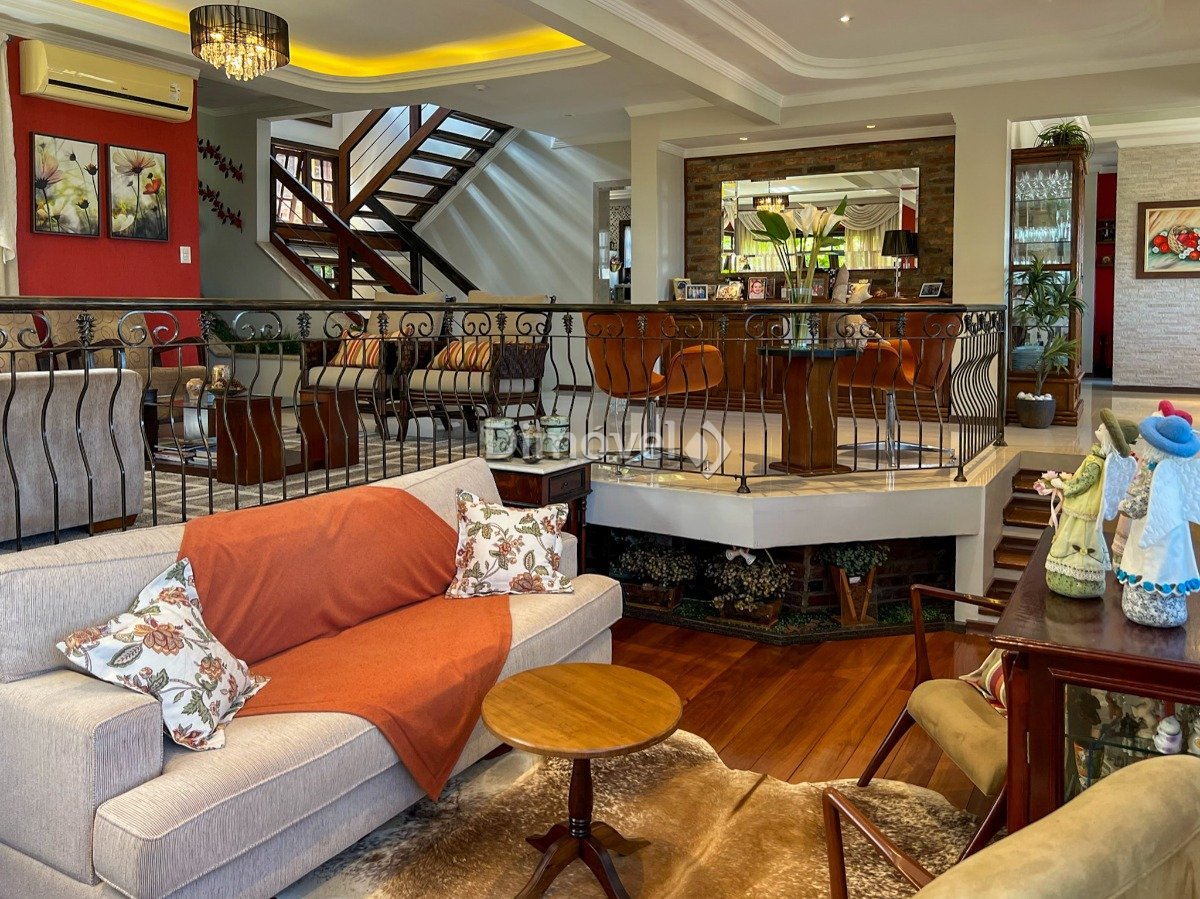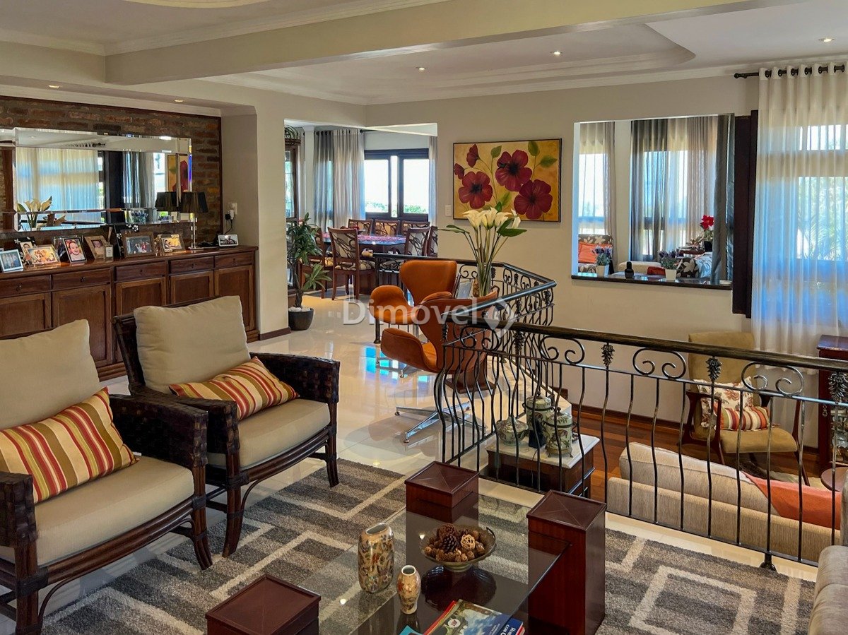 Com um total de 5 suítes, sendo uma suíte master com closet espaçoso, sacada privativa, banheira de hidromassagem, pias e box duplos, e as demais suítes com mezanino, esta residência proporciona a privacidade e o espaço que você e sua família merecem. O amplo living, com 4 ambientes e uma lareira acolhedora, cria um ambiente perfeito para receber e desfrutar momentos especiais. Além disso, você encontrará uma cozinha integrada com área de churrasqueira interna, sala de TV, escritório completo, lavanderia, ateliê, adega e sauna.
